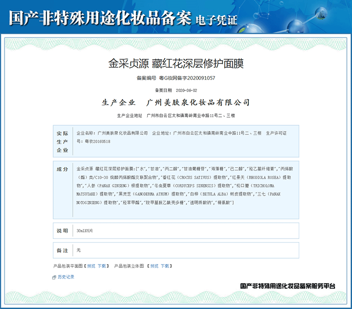 藏(zang)紅花(hua)深層修護(hu)面(mian)膜備案憑證